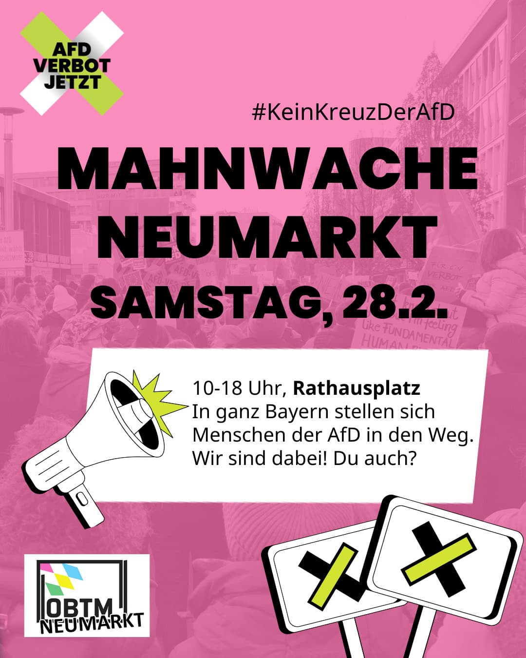Das alles sind weitere Beweise, die für ein Verbotsverfahren gegen die AfD relevant sind – und dafür kämpfen wir als Lokalgruppe Erlangen-Nürnberg der Kampagne “Menschenwürde verteidigen – AfD-Verbot jetzt!”.