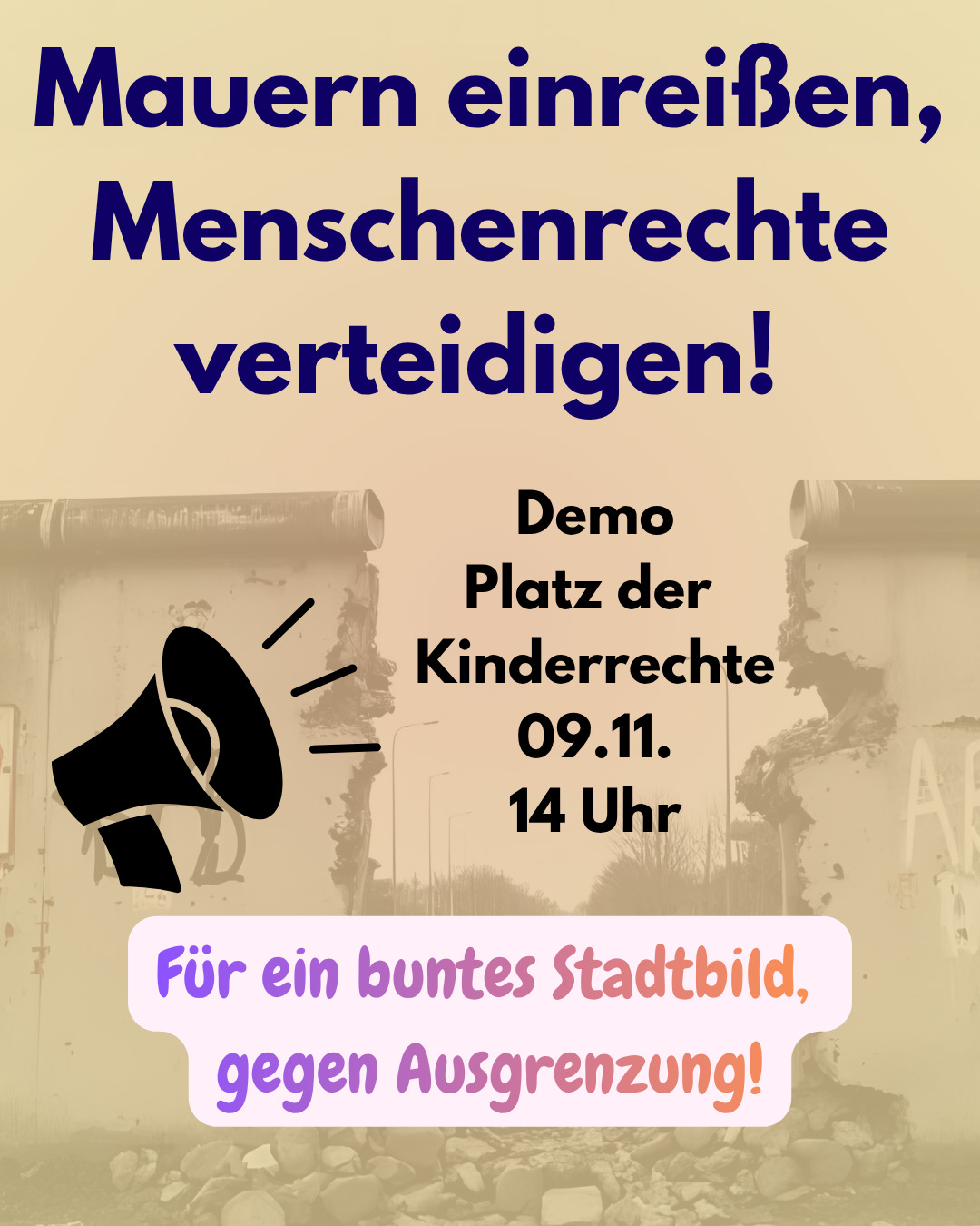 Am Sonntag möchten wir unter dem Motto “Mauern einreißen, Menschenrechte verteidigen” mit euch auf die Straße gehen. Gemeinsam möchten wir uns für ein buntes Stadtbild, gegen Ausgrenzung einsetzen.