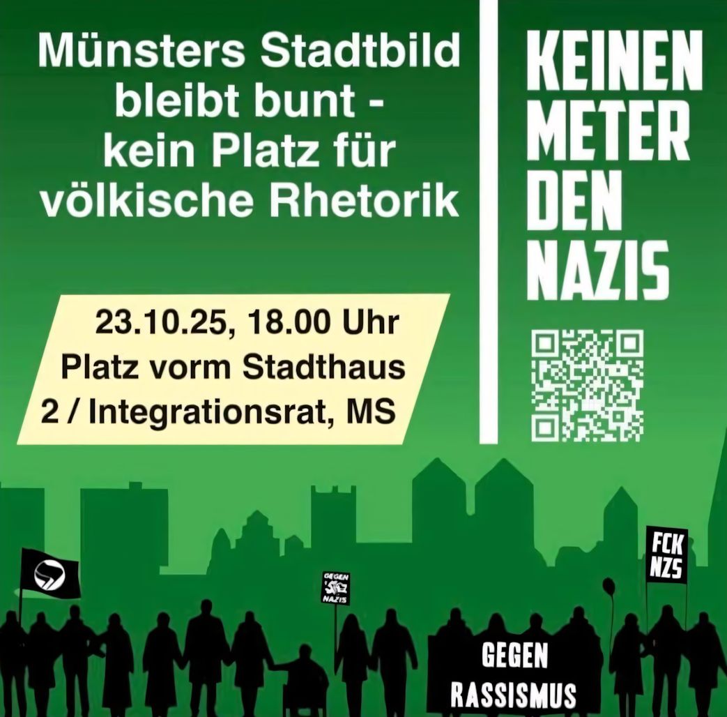 “Münsters Stadtbild ist und bleibt bunt und dafür gehen wir am Donnerstag auf die Straße”, macht Bündnissprecher Carsten Peters deutlich: “Es darf kein Platz sein für völkische Rhetorik. Mit den diskriminierenden, abwertenden und rassistischen Aussagen des Bundeskanzlers wird die Gesellschaft gespalten und die extreme Rechte gestärkt, nicht geschwächt.