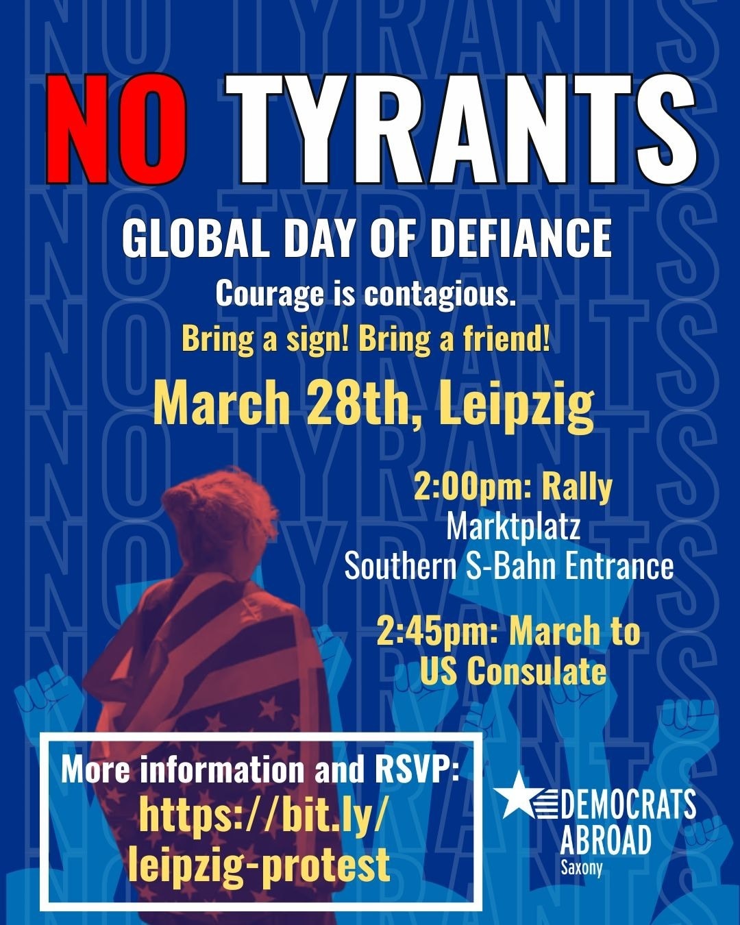 On March 28, we will gather in solidarity with the global No Kings protests. Under the banner No Tyrants, we join Americans and allies around the world in affirming a simple but powerful principle: democracy means no kings, no strongmen, and no one above the law.