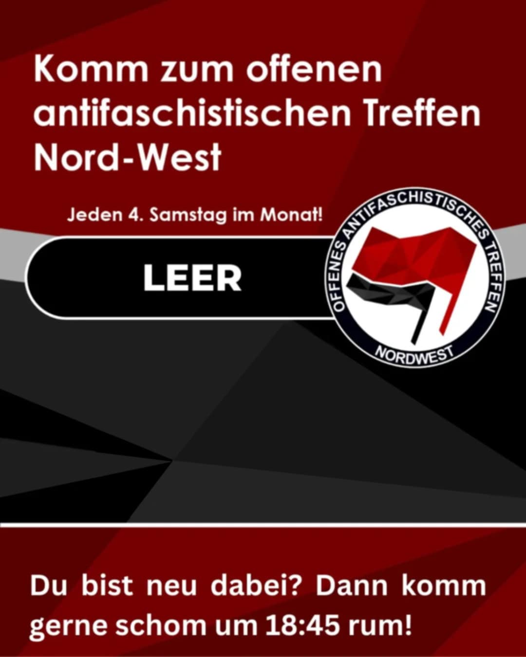 Jeden 4. Samstag findet um 19:00 Uhr das offene Antifaschistische Treffen Nord-West statt!