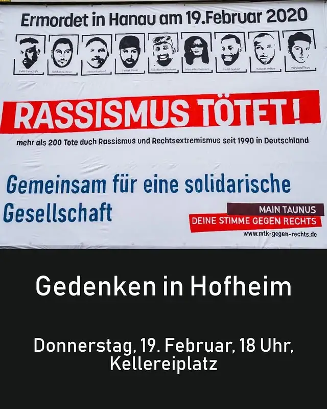 Mit einer Mahnwache erinnert das Bündnis MTK gegen Rechts an Ferhat Unvar, Hamza Kurtović, Said Nesar Hashemi, Vili Viorel Păun, Mercedes Kierpacz, Kaloyan Velkov, Fatih Saraçoğlu, Sedat Gürbüz und Gökhan Gültekin. Es werden Kurzbiografien der neun Menschen vorgelesen, die vor sechs Jahren aus rassistischen Motiven in Hanau ermordet wurden, nur rund 50 Kilometer von Hofheim entfernt. Noch immer sind viele Fragen der Hinterbliebenen unbeantwortet, etwa zum Handeln der Sicherheitsbehörden im Vorfeld des Attentats, in der Tatnacht und bei der Aufarbeitung.