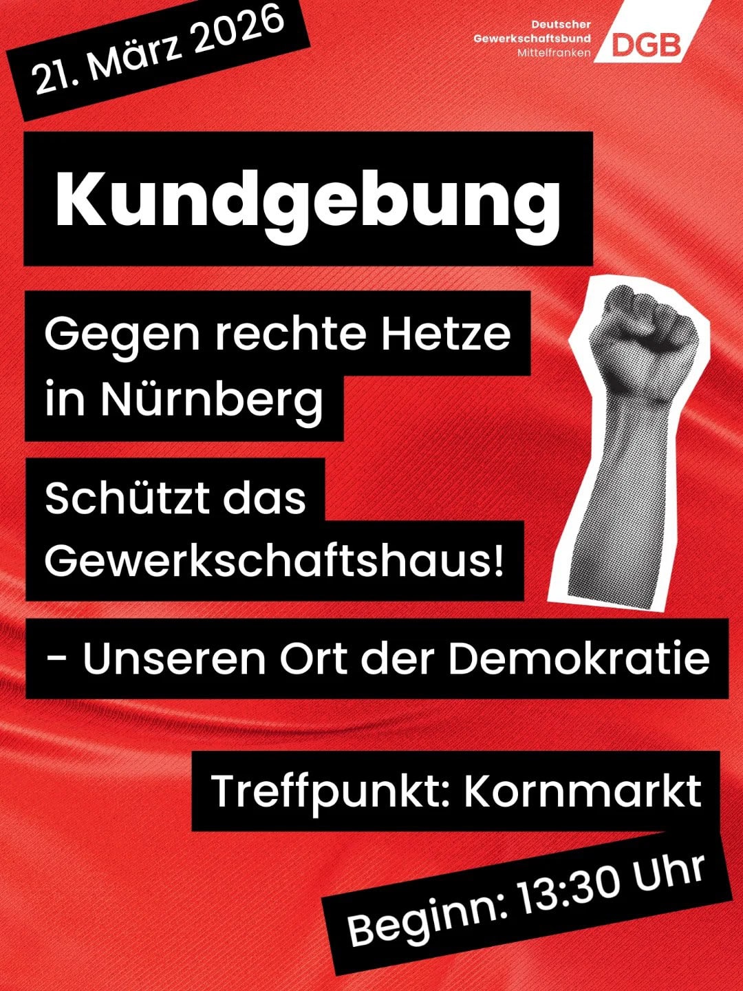 Am kommenden Samstag will die rechtsextreme Gruppierung „Team Menschenrechte“ eine Kundgebung direkt vor unserem Gewerkschaftshaus am Kornmarkt abhalten. Angesichts der wiederholten Angriffe auf unser Haus und uns als Gewerkschafter*innen können und werden wir das nicht unbeantwortet lassen.