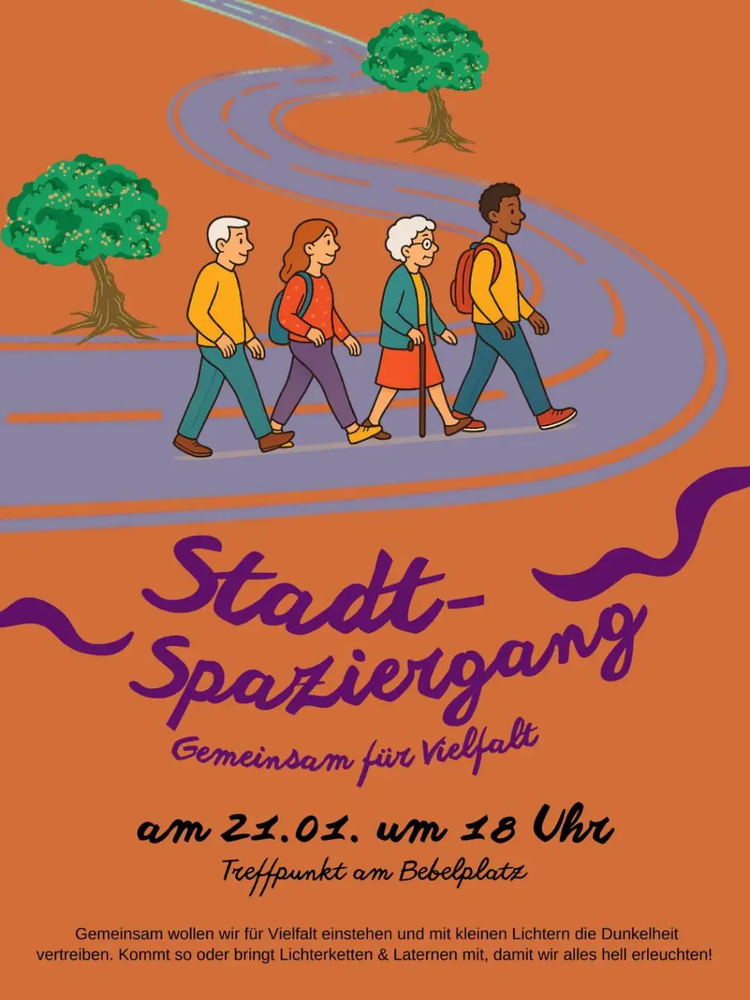 Wenn auch du Lust hast ein Zeichen für Vielfalt zu setzen, dann komm mit uns spazieren. Wir machen uns gegenseitig Licht in politisch & meteorologisch dunklen Zeiten.