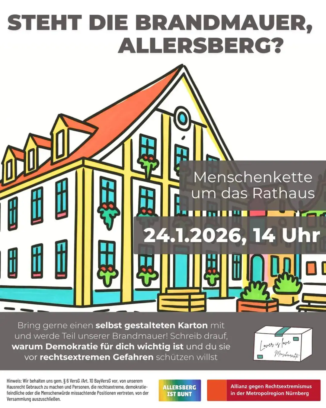 Mit einer Menschenkette um das Allersberger Rathaus und einer symbolischen Brandmauer setzen wir ein friedliches, sichtbares Zeichen:
