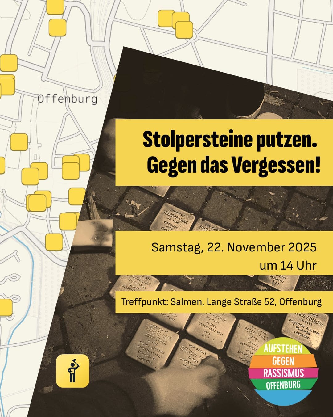 In Offenburg erinnern heute rund 120 Stolpersteine an diese Verbrechen. Sie sind in der gesamten Stadt verteilt und an Orten eingelassen, an denen früher jüdische Bürger lebten oder wirkten. Bei der geplanten Reinigungsaktion werden diese Steine geputzt, um das Andenken an die Opfer sichtbar- und wachzuhalten. Die Veranstalter möchten damit nicht nur ein Zeichen des Gedenkens setzen, sondern auch ein klares Signal gegen Antisemitismus, Rassismus, Ausgrenzung und Hass in der Gesellschaft.