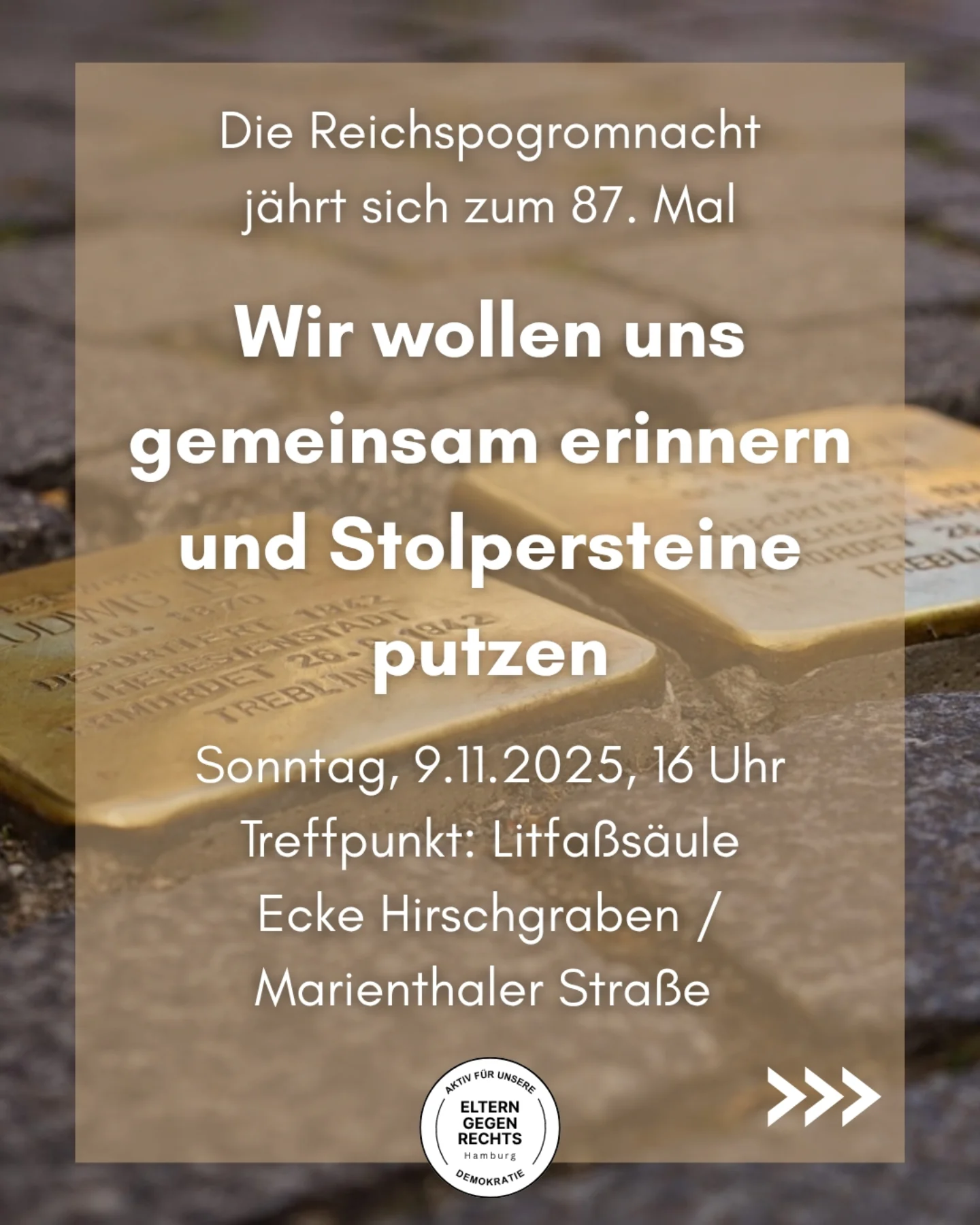 Wir werden ca. eine Stunde zu verschiedenen Stolpersteinen in der Umgebung gehen, Kerzen anzünden und Blumen niederlegen und für Kinder und Erwachsene etwas zur Biographie der jeweiligen Personen erzählen. Im Anschluss haben wir einen Tisch im Café Snoopkram reserviert, um weiter über das Thema zu sprechen und Interessierten die Möglichkeit zu geben, mehr über Eltern gegen Rechts zu erfahren.
