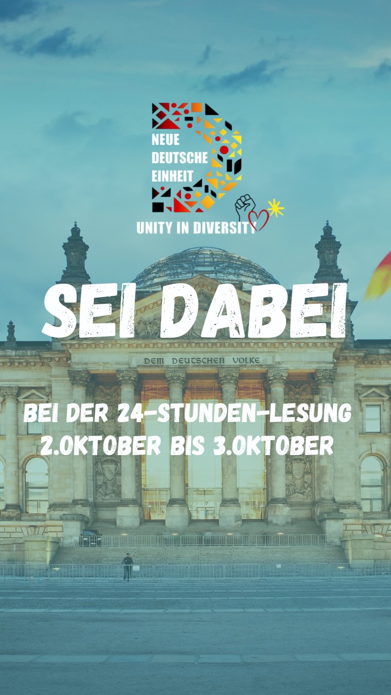 Am 2. Oktober wird Berlin laut – mit leisen Stimmen. Vor dem Bundestag liest die Neue Deutsche Einheit 24 Stunden lang Texte gegen Rassismus, Ausgrenzung und den Rechtsruck. Eine Stimme trägt viele Stimmen: Geschichten, die sonst ungehört bleiben. Komm vorbei, unterstütze das Team und setz mit uns ein Zeichen: Die Würde des Menschen ist unantastbar.