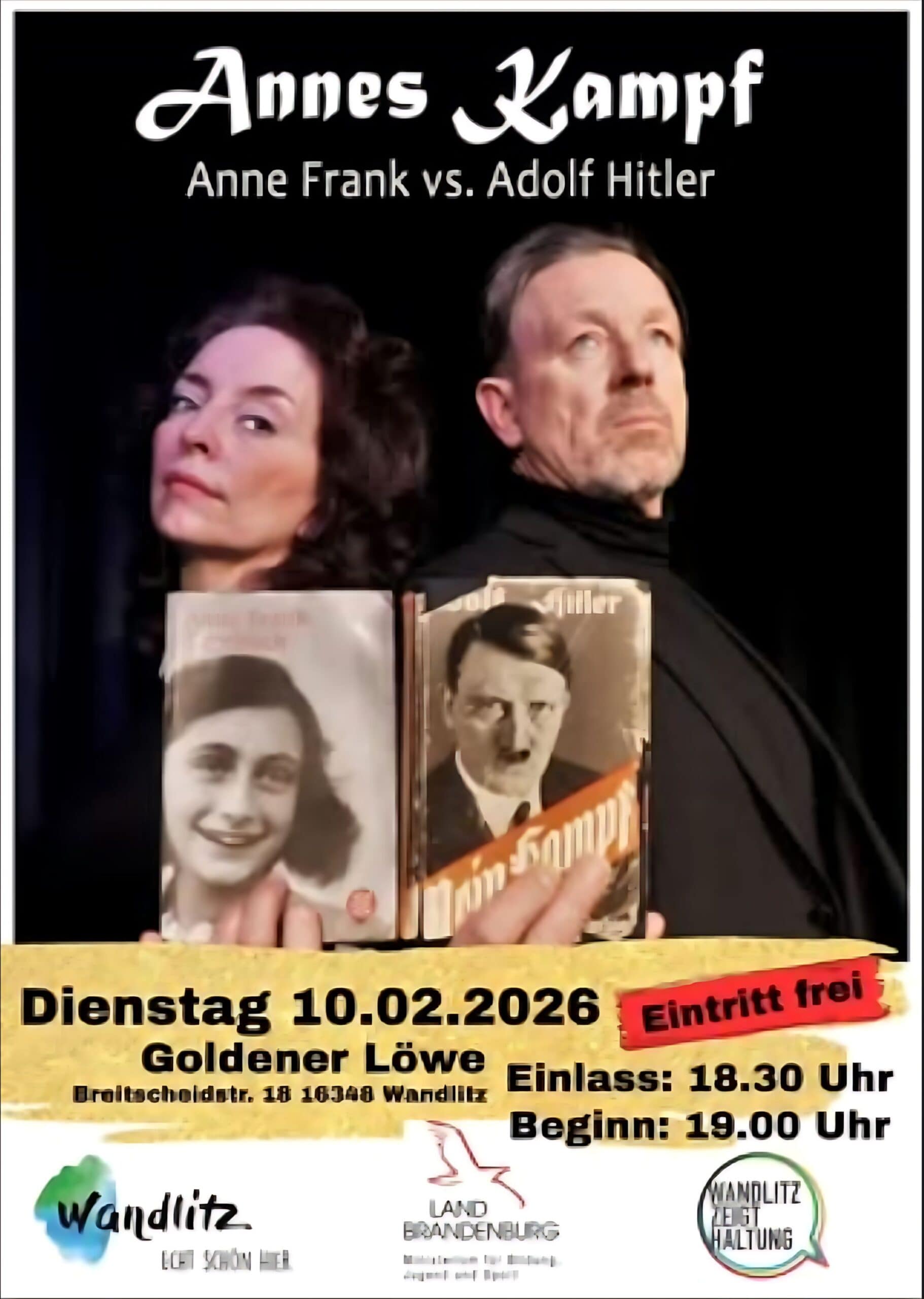 Die Gemeinde Wandlitz zeigt in Kooperation mit der Initiative “Wandlitz zeigt Haltung” das Theaterstück „Annes Kampf“ im Goldenen Löwen.