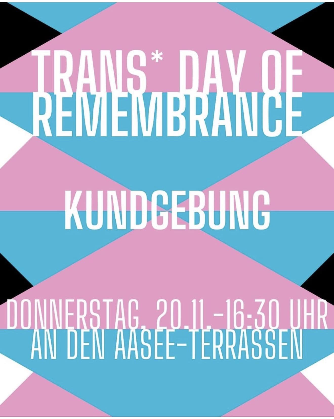 Wir möchten alle trans* Personen und alle, die sich solidarisch zeigen wollen, dazu einladen, den Personen zu gedenken, die von trans* feindlicher Gewalt betroffen waren und sind. Denen, die von Einzelpersonen oder den Gesellschaften in denen sie lebten, umgebracht wurden. Dazu findet am Donnerstag eine Kundgebung an den Aasee-Terrassen statt.