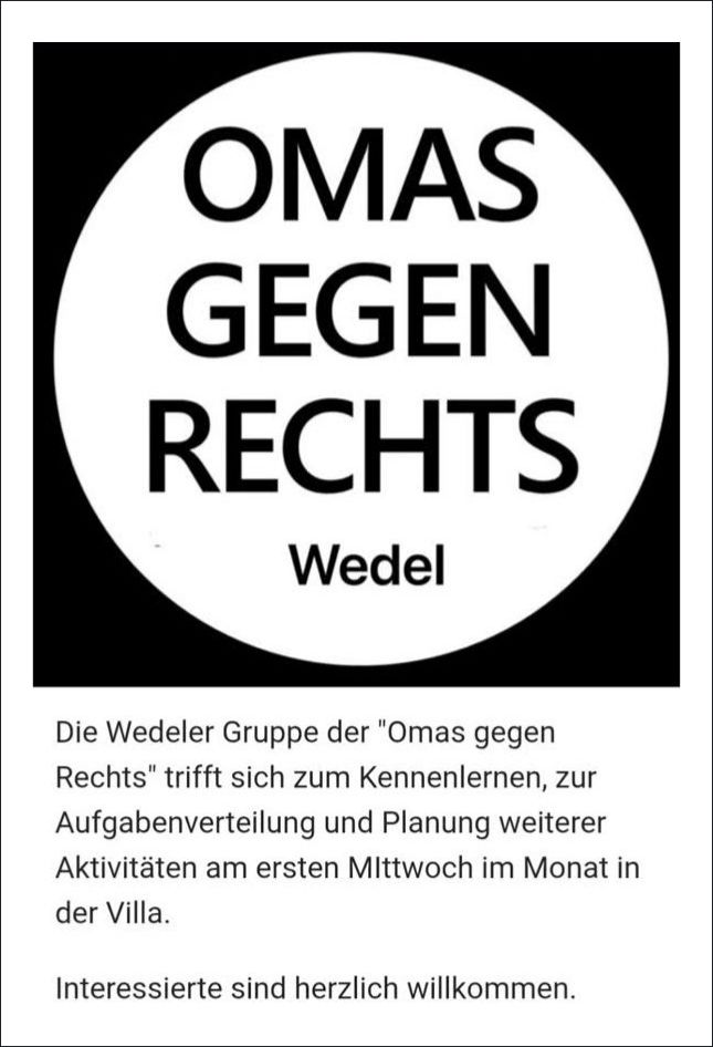 Die Wedeler Gruppe der “Omas gegen Rechts” trifft sich zum Kennenlernen, zur Aufgabenverteilung und Planung weiterer Aktivitäten am ersten Mittwoch im Monat in