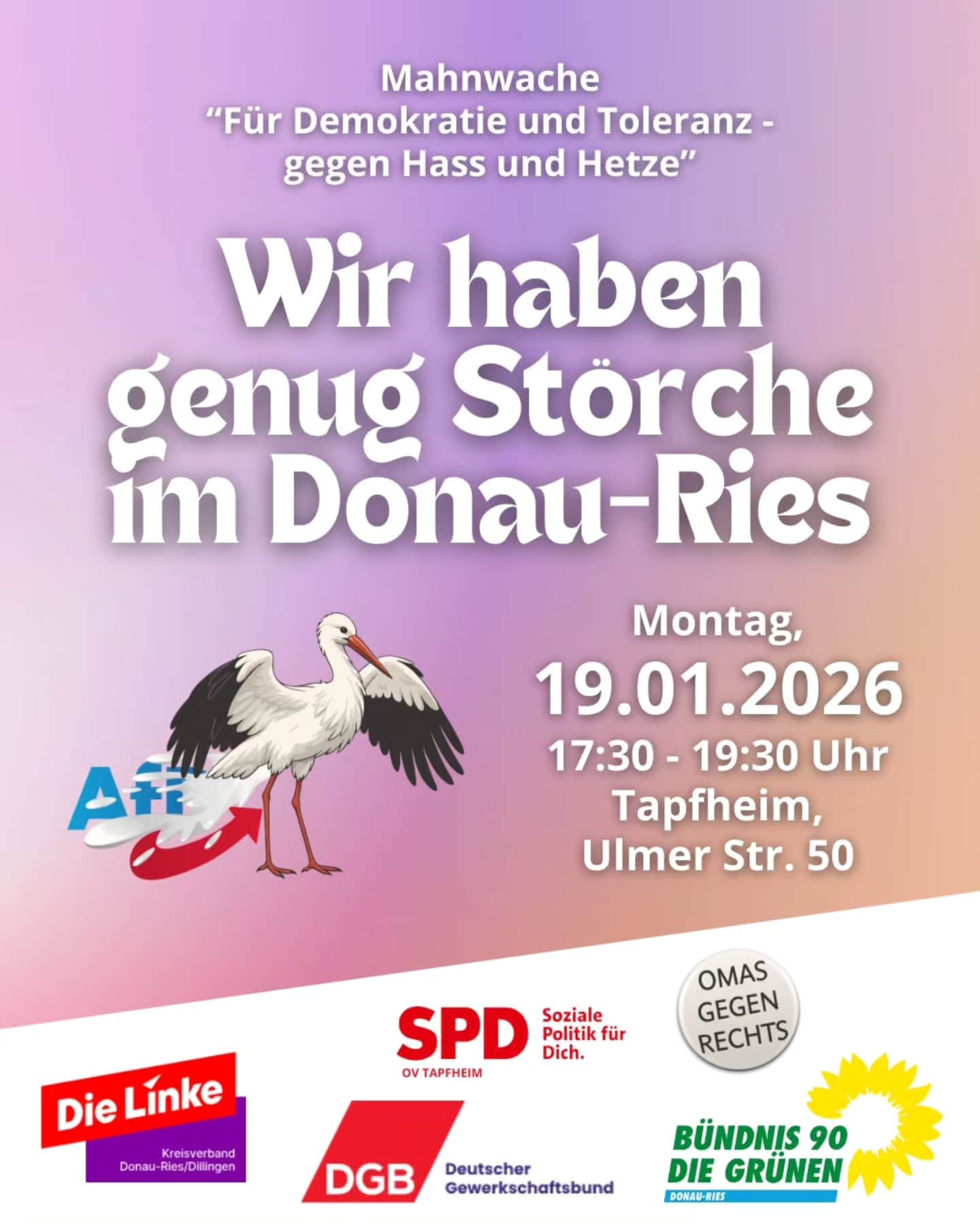 Am Montag lädt die AfD mit Beatrix von Storch nach Tapfheim ein – ohne klares Thema, aber mit viel Hass. Wir sagen: Nicht mit uns!
