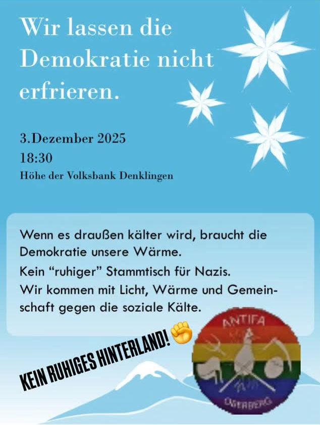 Kein “ruhiger” Stammtisch für Nazis. Wir kommen mit Licht, Wärme und Gemeinschaft gegen die soziale Kälte.
