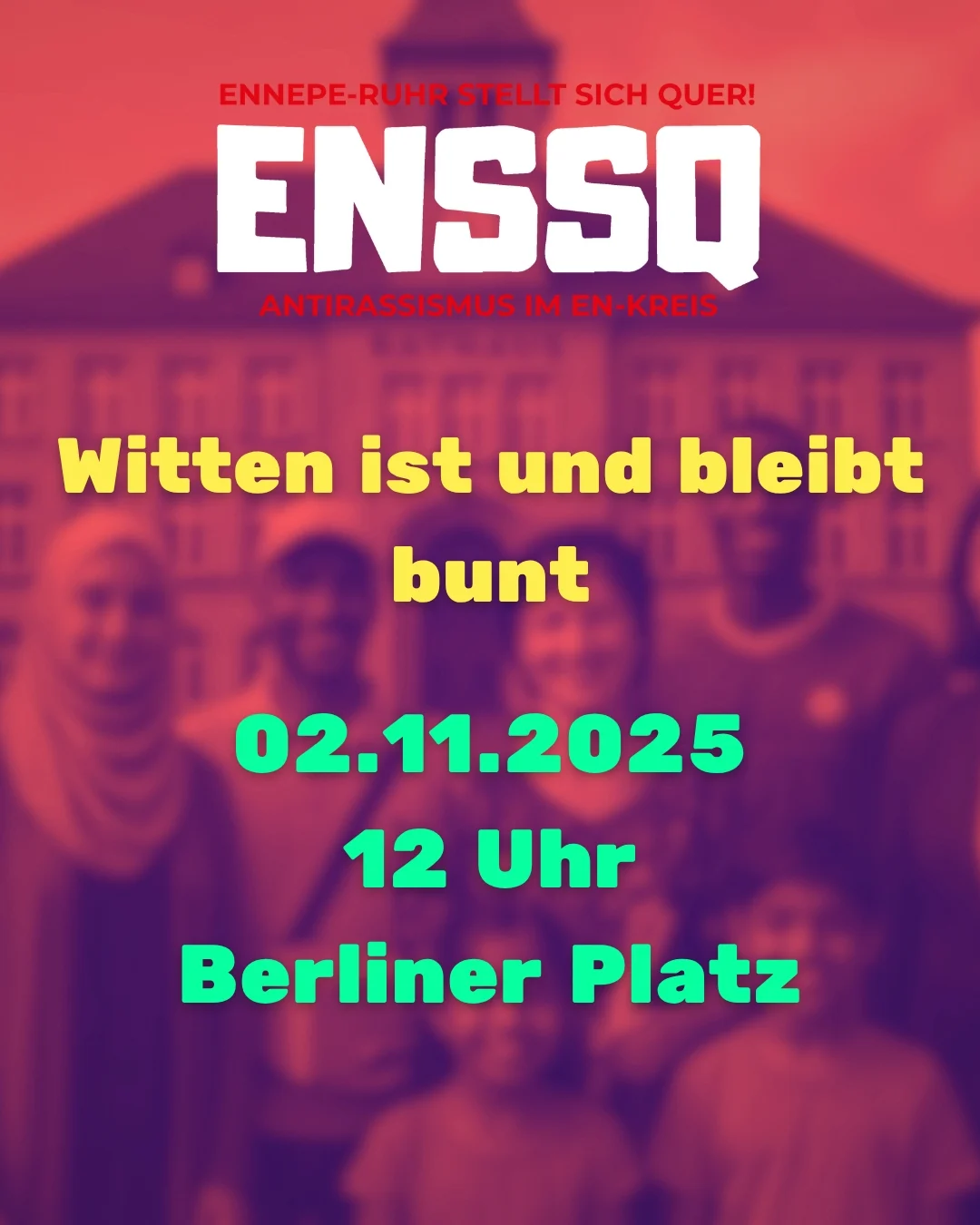 Darum kommen wir am Sonntag zum Berliner Platz und zeigen, dass wir in Witten solidarisch sind mit allen Bürger:innen unserer Stadt: Witten ist und bleibt bunt!