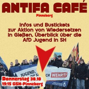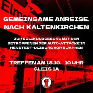 10:00Gemeinsame Anreise aus Elmshorn nach Kaltenkirchen zu “Kein Vergessen Rechter Gewalt”AnreiseAbgelaufen
