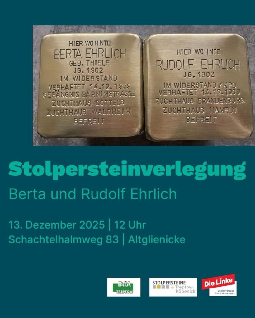 Berta und Rudolf Ehrlich Mit Stolpersteinen an die Opfer der Nazi-Barbarei zu erinnern, hat sich die Stolperstein- Initiative vom Bund