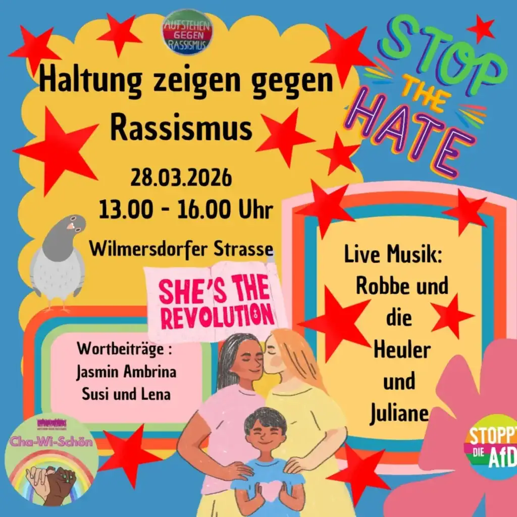 Am Samstag wollen wir mit Euch aufstehen und Haltung zeigen gegen Rassismus! Kommt ab 13.00h in die Wilmersdorfer Strasse. Neben