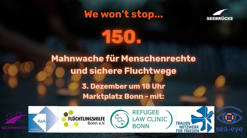 Wir laden ein zur 147. Mahnwache für Menschenrechte der Seebrücke Bonn. Dort plädieren wir weiterhin für sichere und legale Fluchtwege,