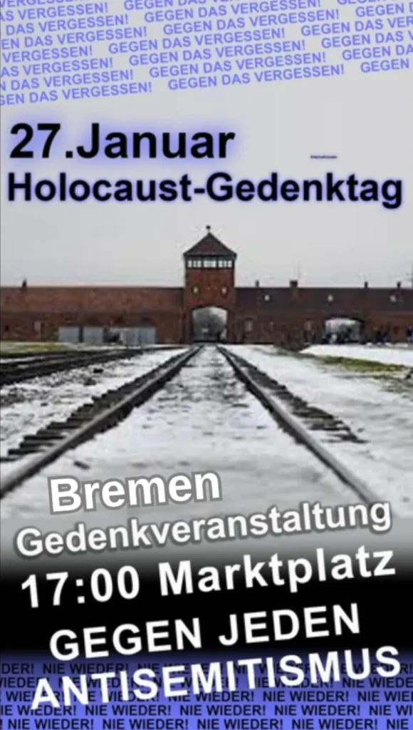 Am 27.1.2026 um 17 Uhr Bremer Marktplatz finde eine privat organisierte Gedenkveranstaltung statt zum internationalen Holocaust-Gedenktag. Diese Gedenkveranstaltung unterstützen wir