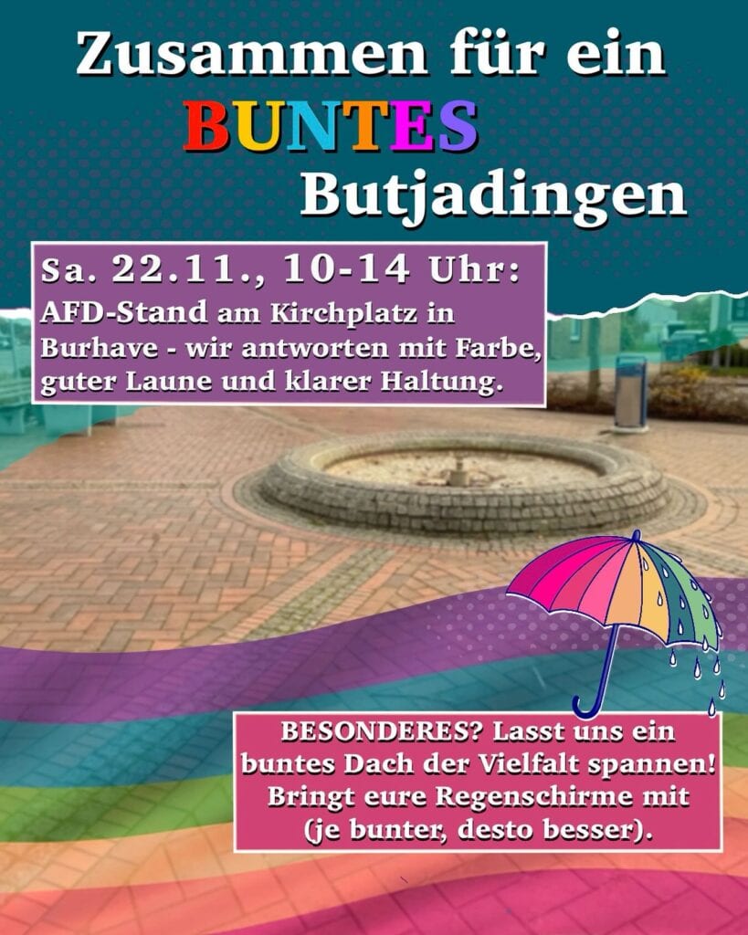 AfD-Stand am Kirchplatz in Burhave – wir antworten mit Farbe, guter Laune und klarer Haltung. Besonderes? Lasst uns ein buntes […]