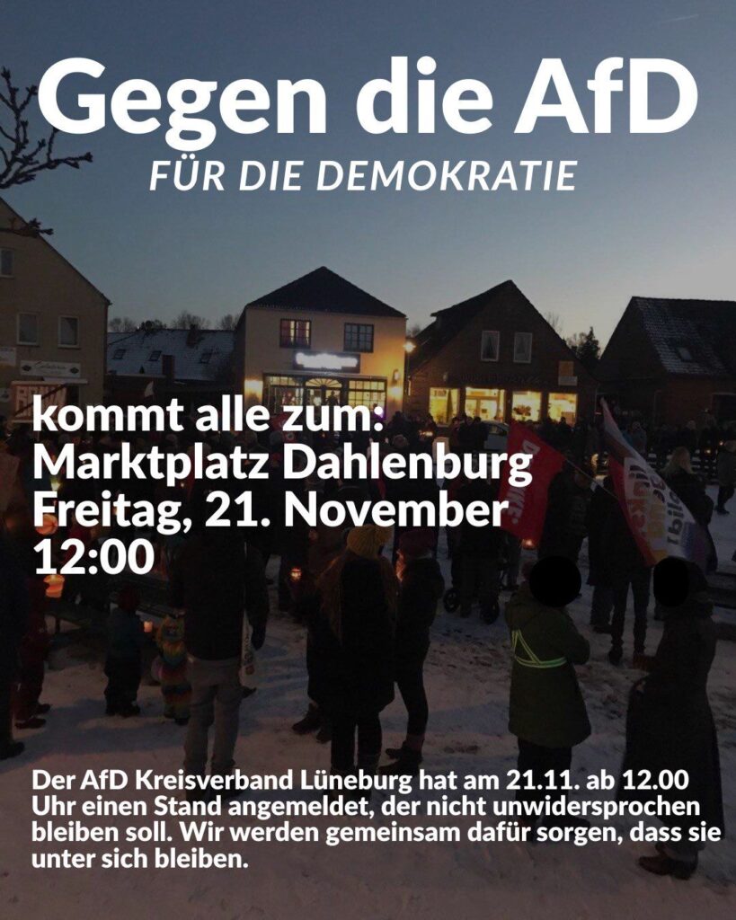 Bunter Widerstand vieler Initiativen auf dem Dahlenburger Marktplatz. Der AfD Kreisverband Lüneburg hat Freitag einen Stand angemeldet, der nicht unwidersprochen bleiben […]