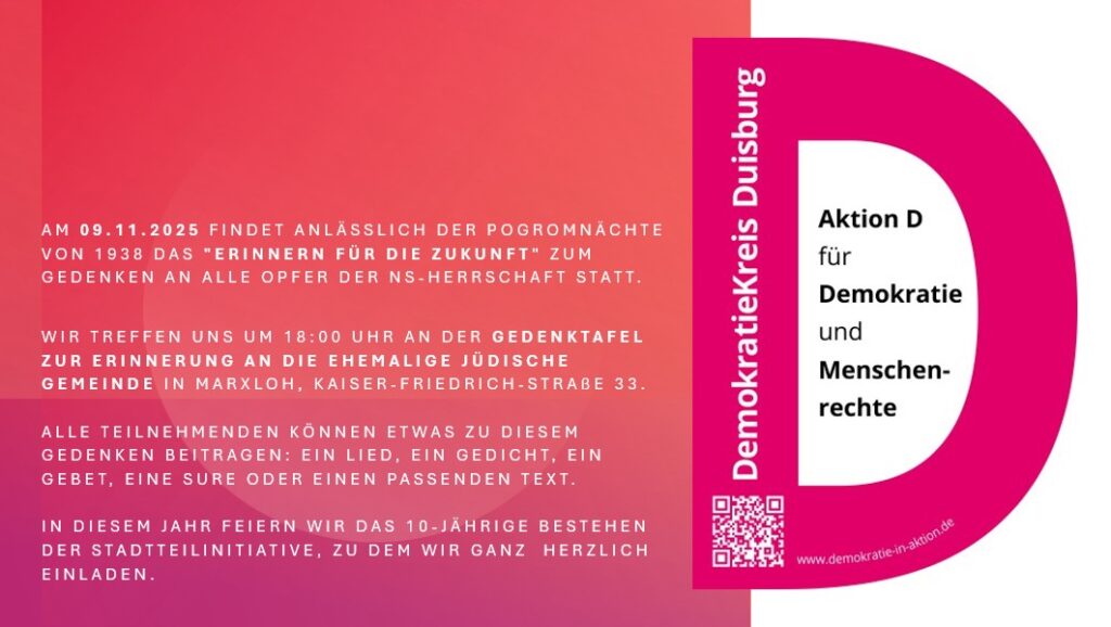 Am 9. November findet Anlässlich der Pogromnächte von 1938 das “Erinnern für die Zukunft” zum Gedenken an alle Opfer der