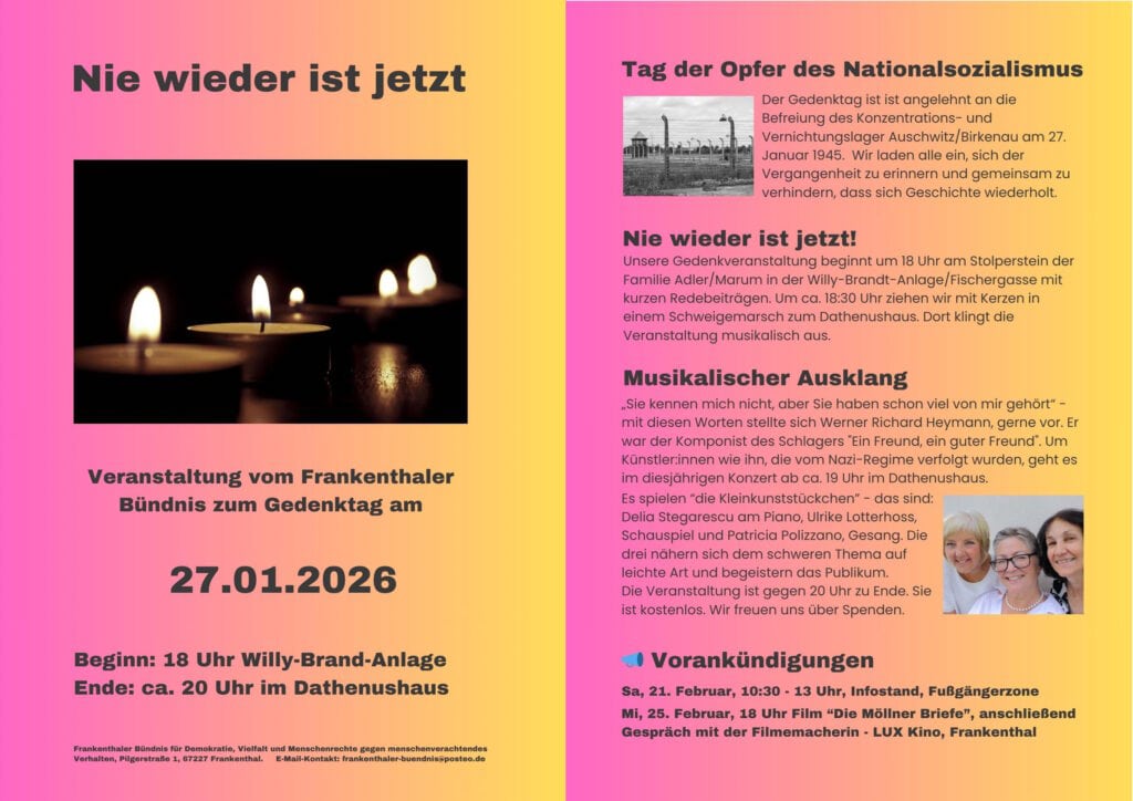Kundgebung – Schweigemarsch mit Kerzen – Konzert Am 27. Januar ist der internationale Gedenktag für die Opfer des Nationalsozialismus. Wie […]