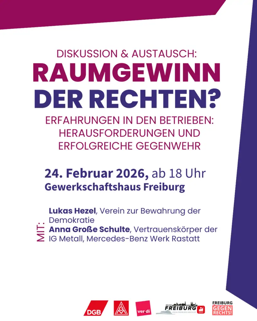 Raumgewinn der Rechten? Ein Austausch über Erfahrungen in den Betrieben, Herausforderungen und erfolgreiche Gegenwehr Im Gewerkschaftshaus Freiburg Mit Lukas Hezel,