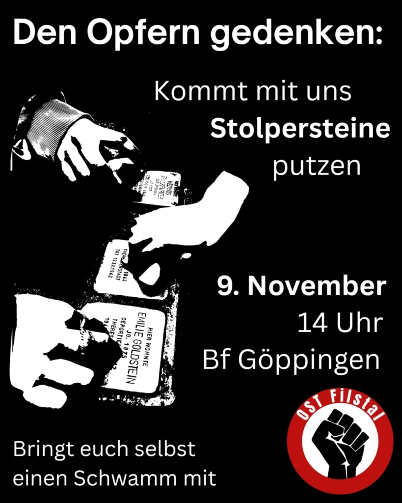 Liebe Genoss:innen, Am 9. November rufen wir auf, zum Gedenken der Reichspogromnacht, Stolpersteine zu putzen. Dazu treffen wir uns  am […]