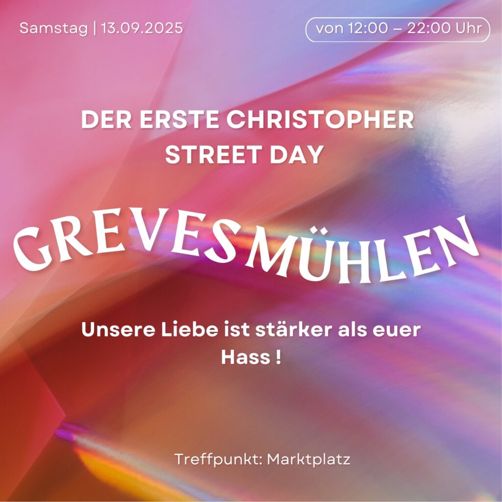 Erster CSD in Grevesmühlen! Es ist soweit: Grevesmühlen bekommt seinen ersten CSD! Unter dem Motto “Unsere Liebe ist stärker als […]