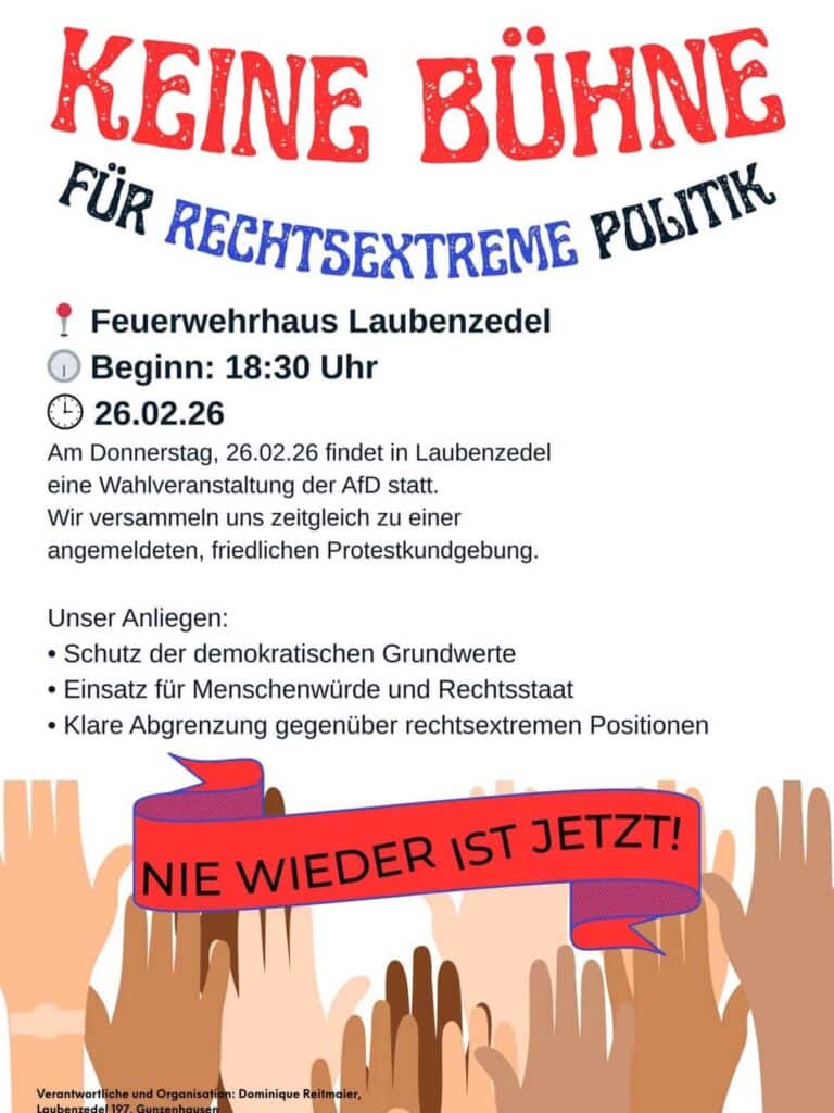 Am Donnerstag in Laubenzedel eine Wahlveranstaltung der AfD statt. Wir versammeln uns Zeitgleich zu einer angemeldeten, friedlichen Protestkundgebung. Unser Anliegen: […]