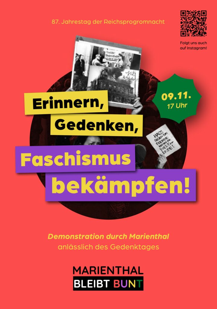 Demonstration durch Marienthal – 87. Jahrestag der Reichspogromnacht Mahnmal für alle, die mitmachen oder weggucken Der Gedenktag zur Reichspogromnacht erinnert