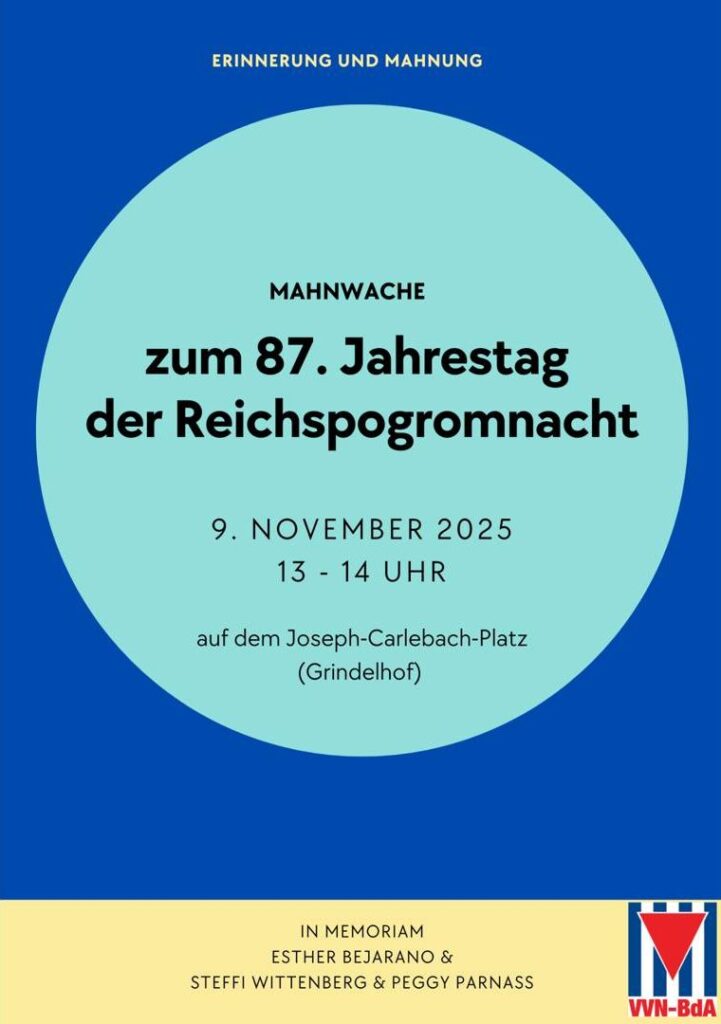 Anlässlich des 87. Jahrestags der Reichspogromnacht findet am Sonntag eine Mahnwache auf dem Joseph-Carlebach-Platz (Grindelhof) statt. An diesem Ort wurde