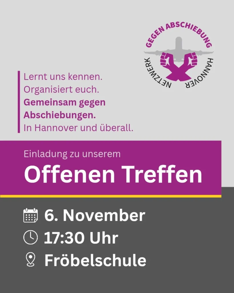 Wir laden euch herzlich zu unserem offenen Treffen ein. Lernt uns kennen. Organisiert euch. Gemeinsam gegen Abschiebungen. In Hannover und