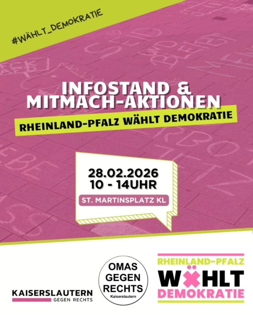 Update: neuen Ort beachten! Infostand & Mitmach-Aktionen Die Omas gegen Rechts und Kaiserslautern gegen Rechts laden ein zum Aktionstag “Rheinland-Pfalz