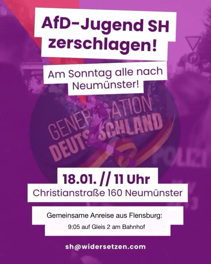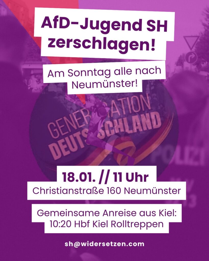 AfD-Jugend SH zerschlagen! Der Gründungsversammlung der AfD-Jugend in Schleswig-Holstein widersetzen! Alle nach Neumünster! Nachdem sich die AfD-Jugendorganisation „Generation Deutschland“ gegen