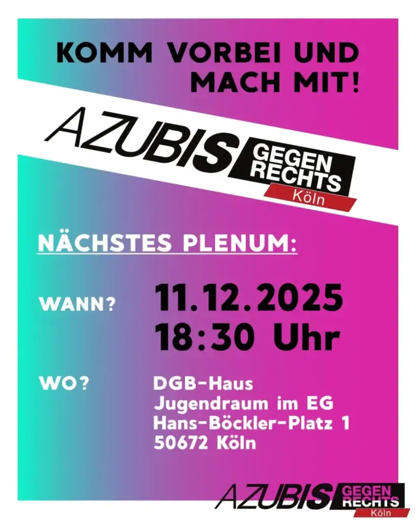 Das nächste Azubis gegen Rechts treffen findet am Mittwoch statt. Komm vorbei wenn du Lust hast mitzumachen, andere junge sich