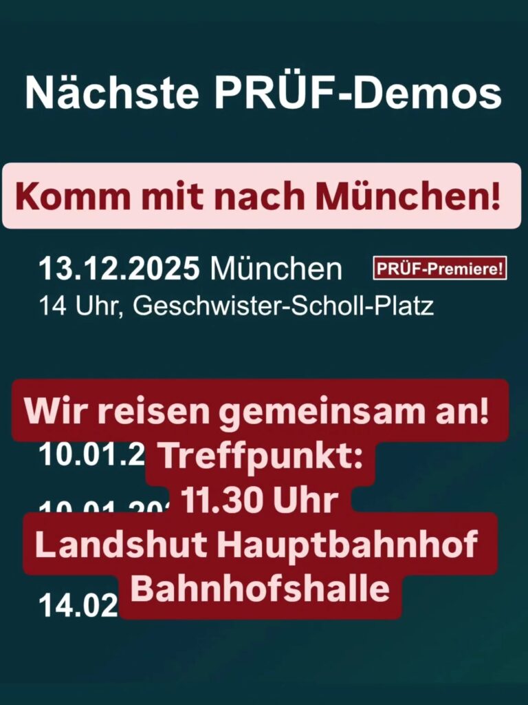 Komm mit uns zur PRÜF-Demo in München! Wir wollen gemeinsam anreisen und Treffen uns in der Bahnhofshalle am Landshuter Hauptbahnhof.