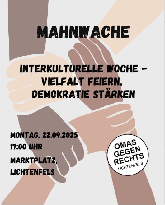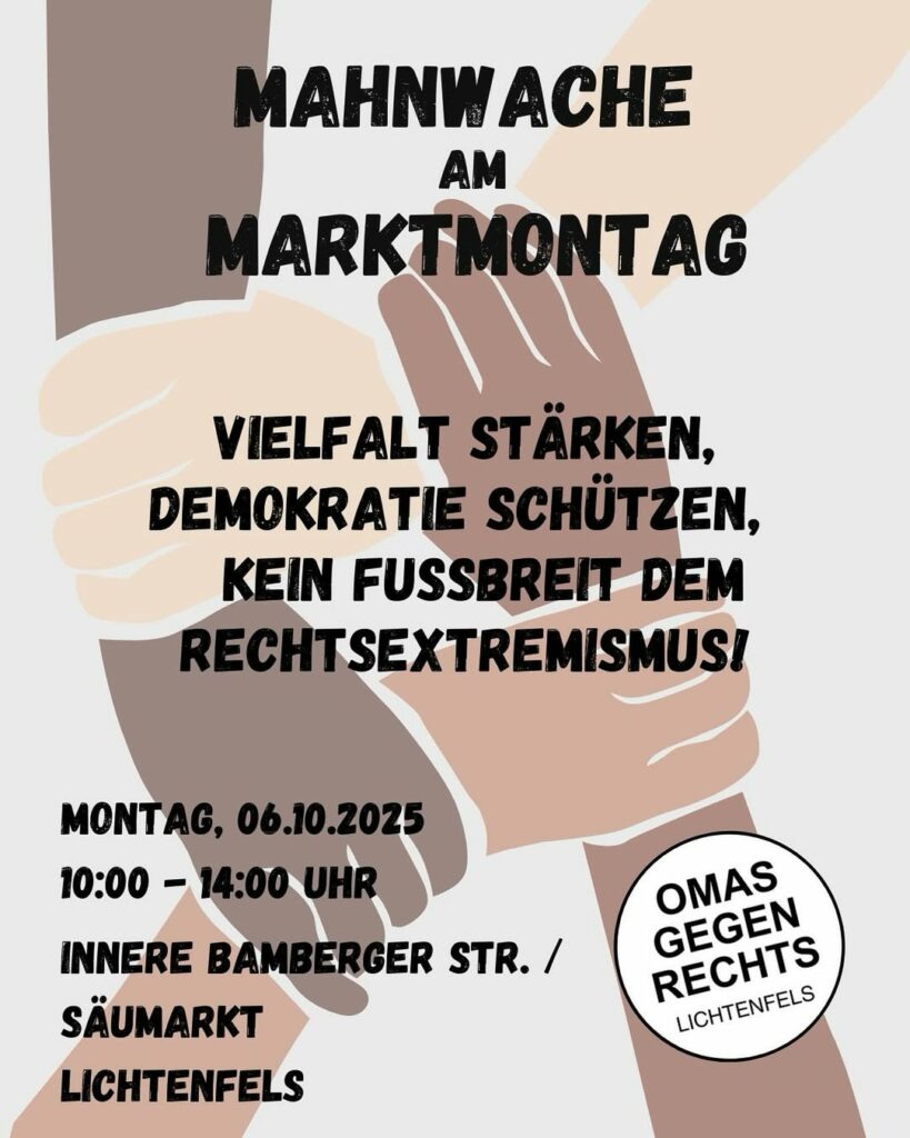 Am Montag sind wir wieder auf dem Marktmontag in Lichtenfels mit einer Mahnwache dabei. Unter dem Motto: – Vielfalt stärken