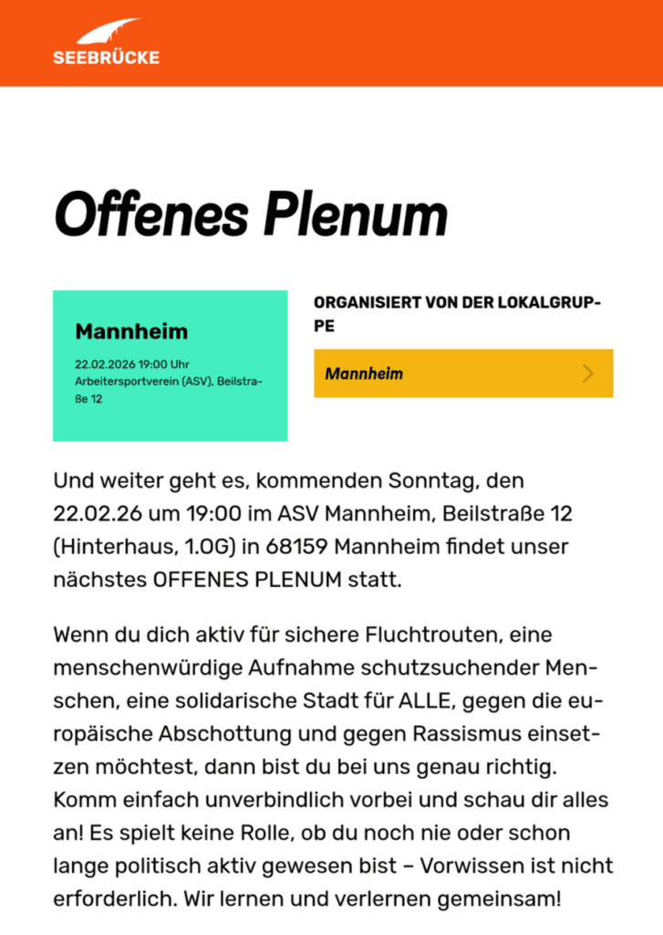 Unser nächstes offenes Plenum findet kommenden Sonntag im ASV Mannheim statt. Wenn du dich aktiv für sichere Fluchtrouten, eine menschenwürdige