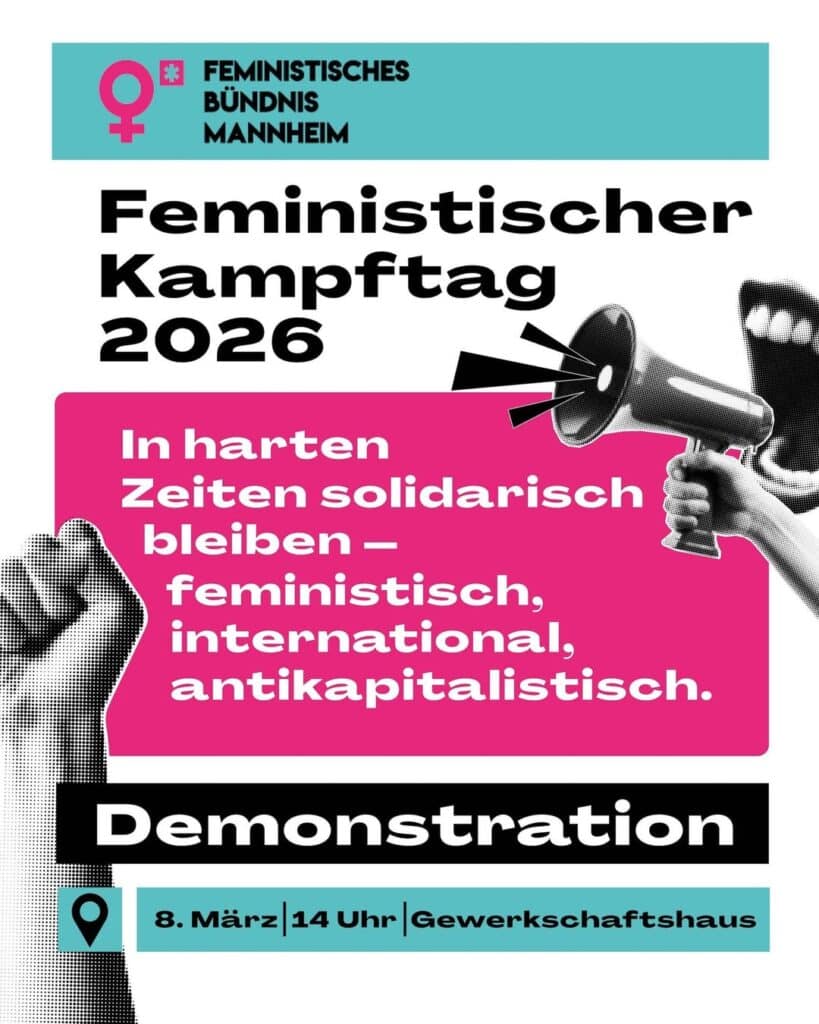 Am 8. März ruft das feministische Bündnis Mannheim auf, unter dem Motto „In harten Zeiten solidarisch bleiben – feministisch, international,