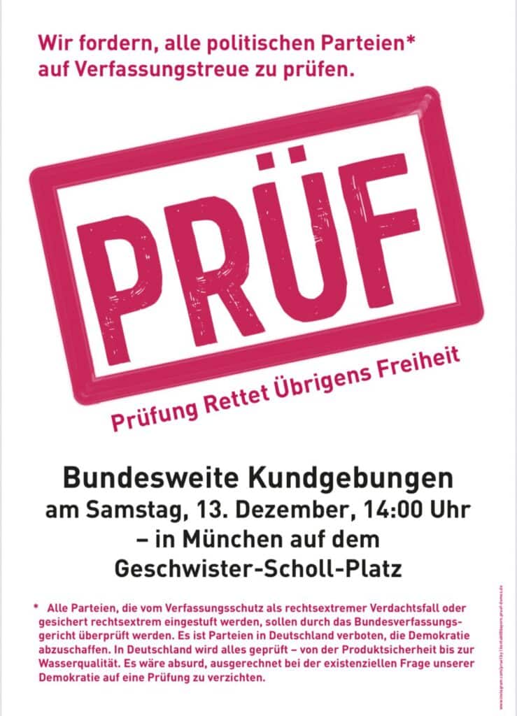 Kundgebung von PRÜF Bayern Wir fordern, alle politischen Parteien* auf Verfassungstreue zu prüfen. *) Alle Parteien, die vom Verfassungsschutz als