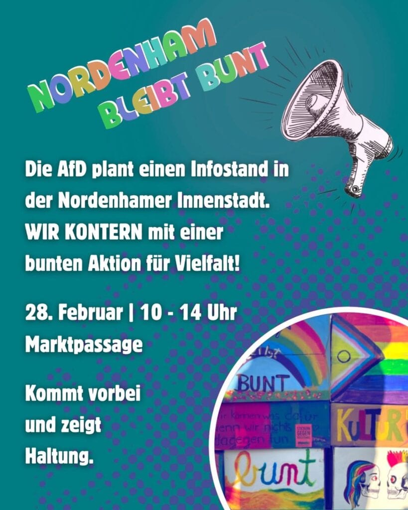 Moin, liebe Nordenham-bleibt-bunt-Menschen Kommt vorbei zur „Zusammenkunft der Kulturen“ am Samstag von 11–14 Uhr! Wir haben den Termin bewusst gewählt, […]