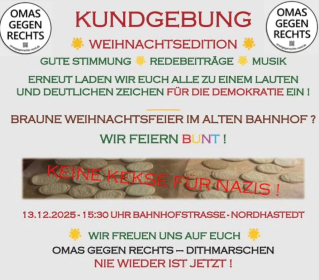 Kundgebung Weihnachtsedition Einmal mehr wollen sich rechte im “Alten Bahnhof” in Nordhastedt treffen, um dort ihrer Propaganda zu fröhnen. Dieses […]