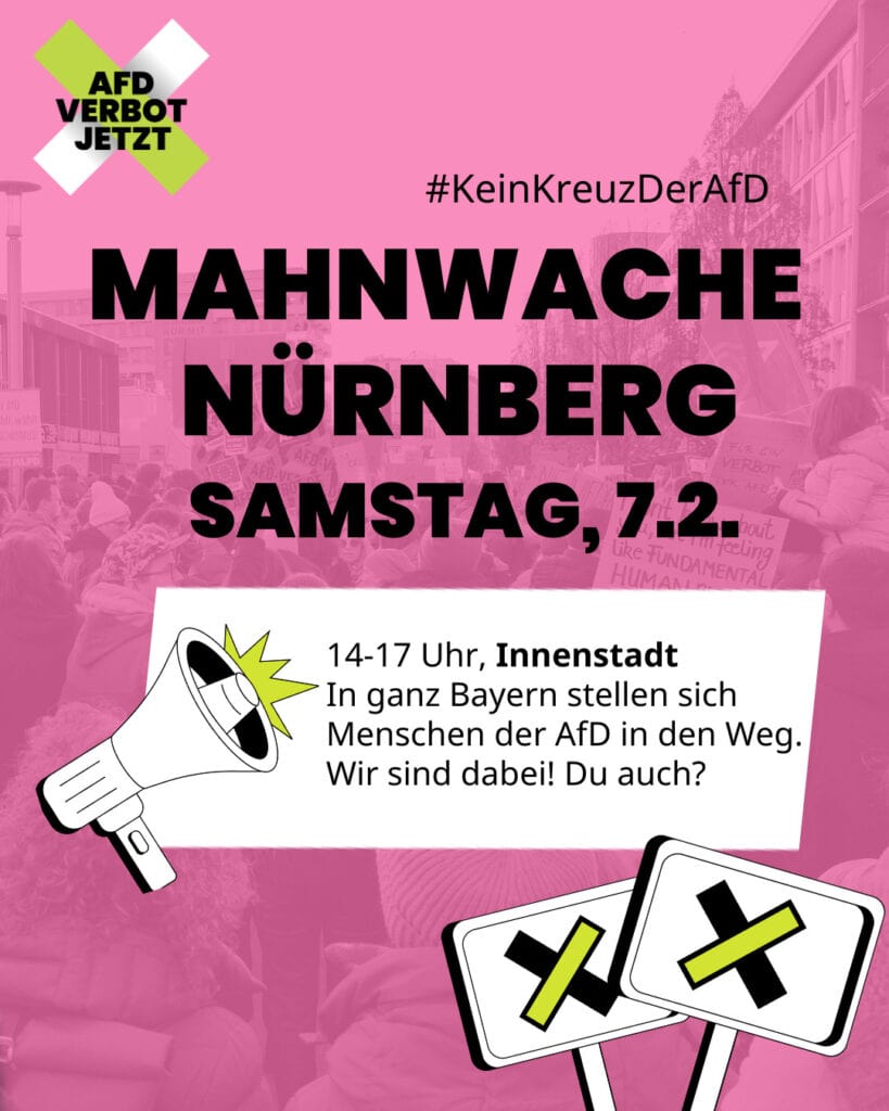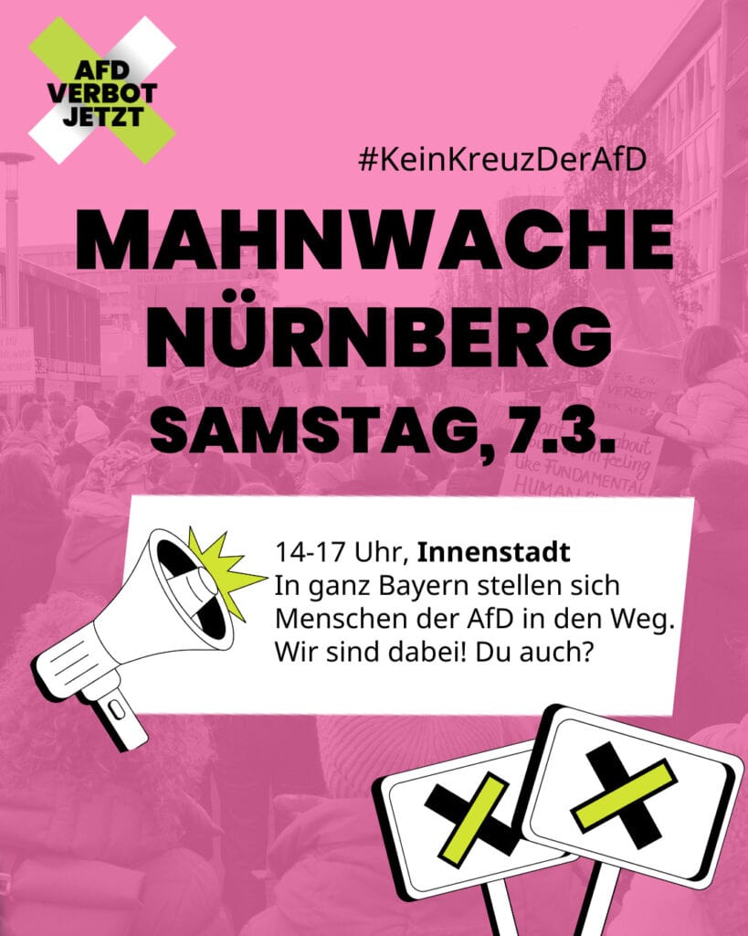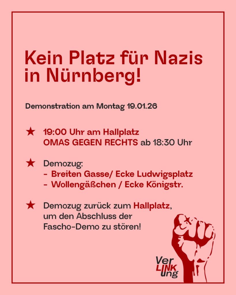 Kein Platz für Nazis in Nürnberg! Hallplatz 18:30 Uhr: Mahnwache, Omas Gegen Rechts 19:00 Uhr: Demozug und Kundgebung, Verlinkungnbg Quelle