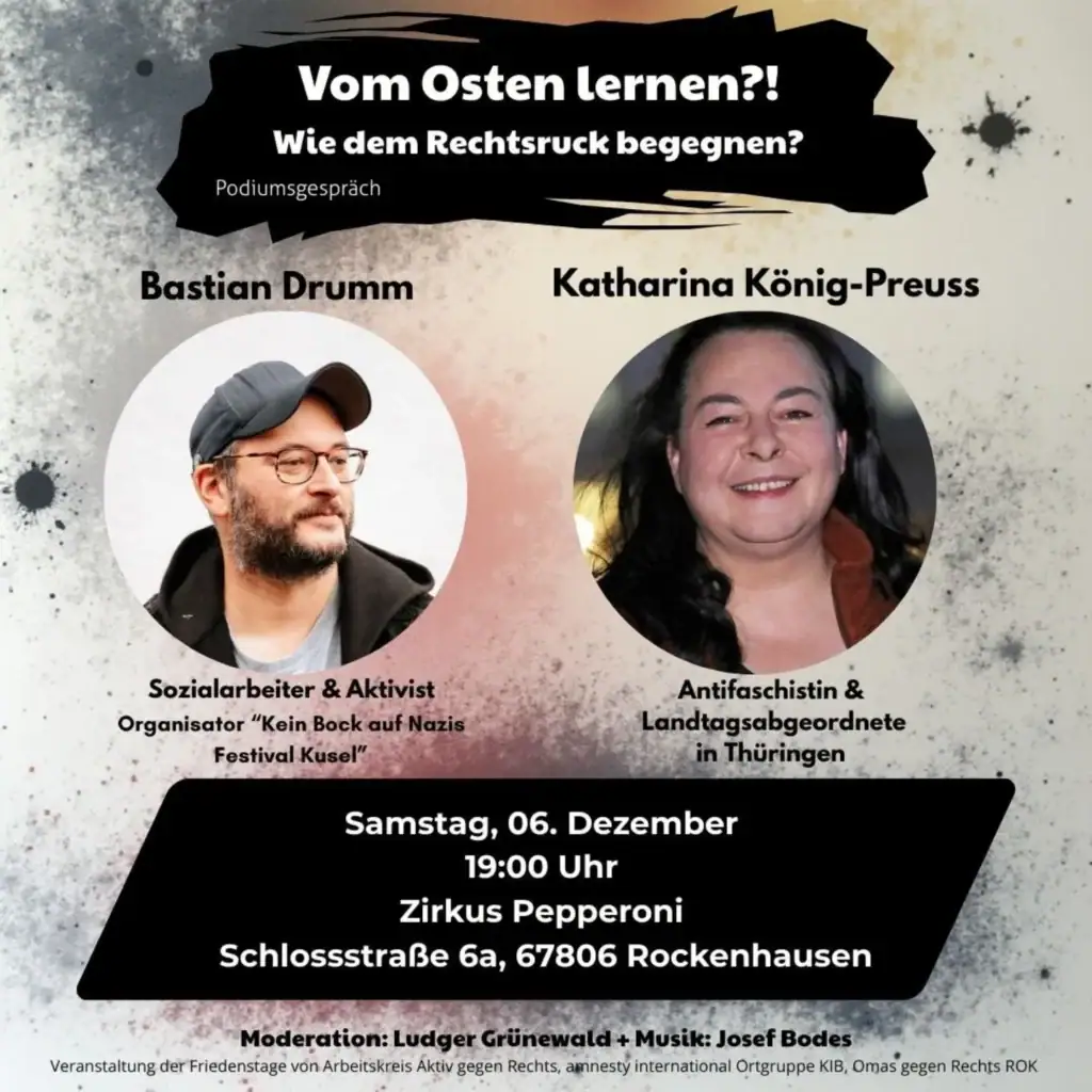 Podiumsgespräch mit Bastian Drumm, Sozialarbeiter und Aktivist, Organisator “Kein Bock auf Nazis Festival Kusel” und Katharina König-Preuss, Antifaschistin und Landtagsabgeordnete in […]