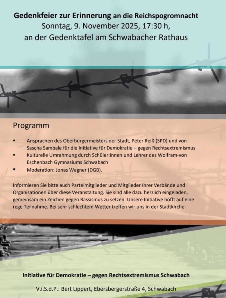 Erinnern heißt handeln! Gedenkfeier zur Reichspogromnacht – am 9. November 2025 um 17:30 Uhr an der Gedenktafel am Schwabacher Rathaus. […]