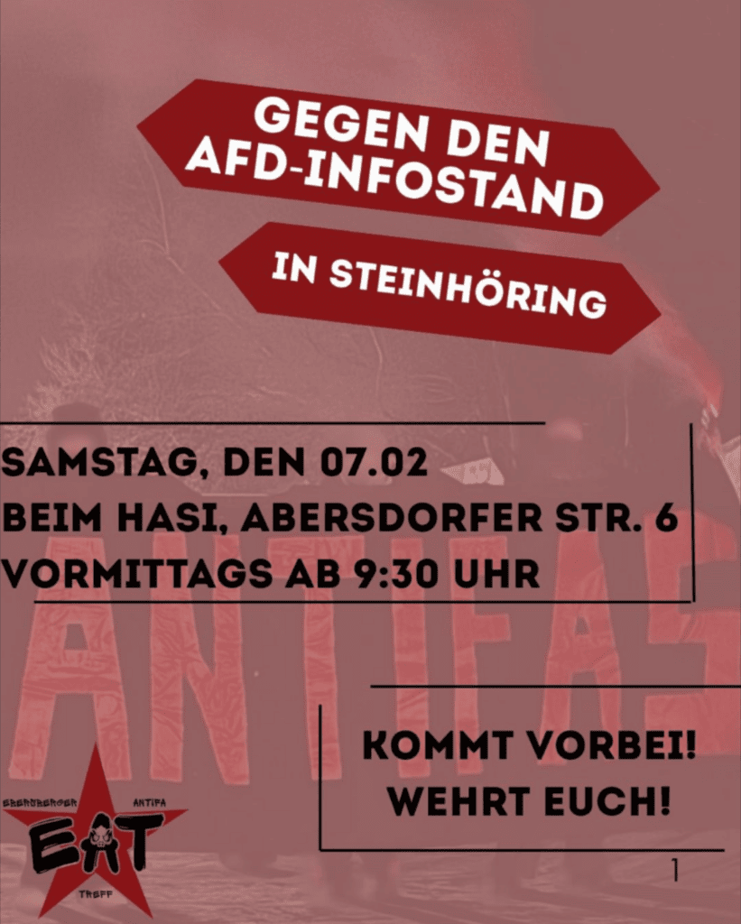 Gegen den AfD Infostand in Steinhöring! Die “AfD” hat für Samstag einen Infostand vor dem Hasi Bäcker in Steinhöring geplant. […]