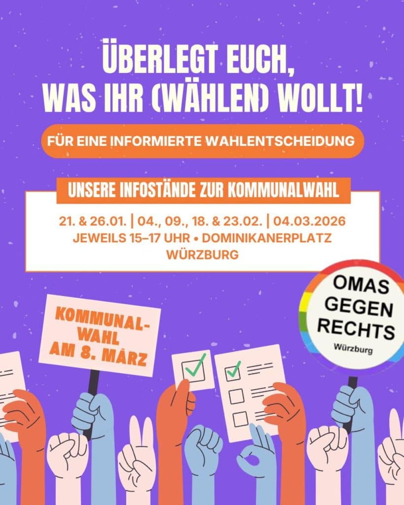 Anlässlich der Kommunalwahl in Würzburg am 8. März 2026 organisieren die Omas gegen Rechts Würzburg regelmäßig Infostände am Dominikanerplatz. Jeweils