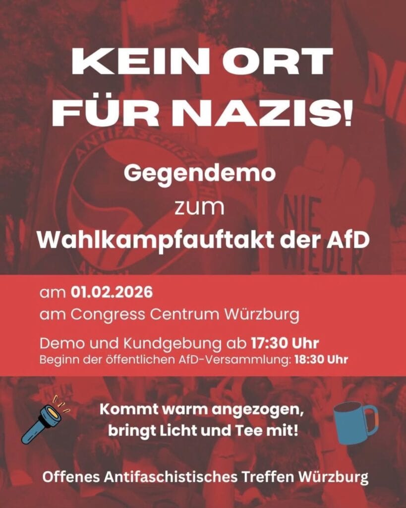 Gegendemo zum Wahlkampfauftakt der AfD Wenn die AfD Würzburg am Sonntag im Congress Centrum ihren Wahlkampf startet, darf das nicht
